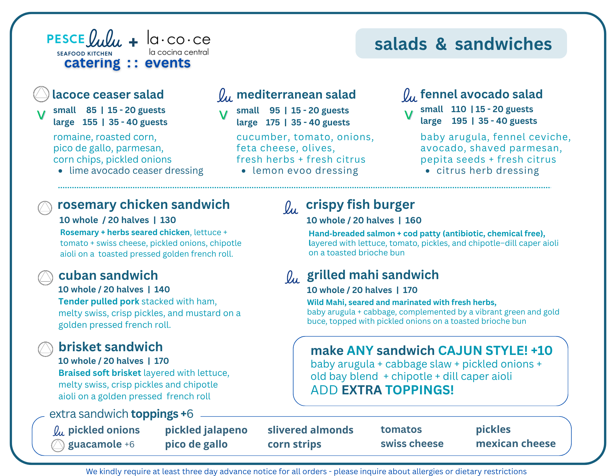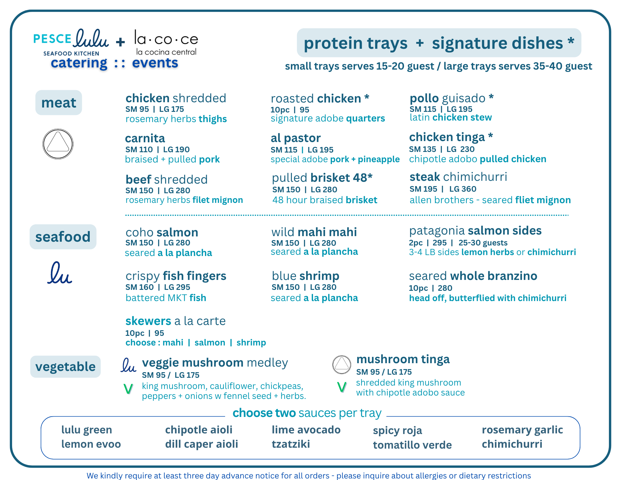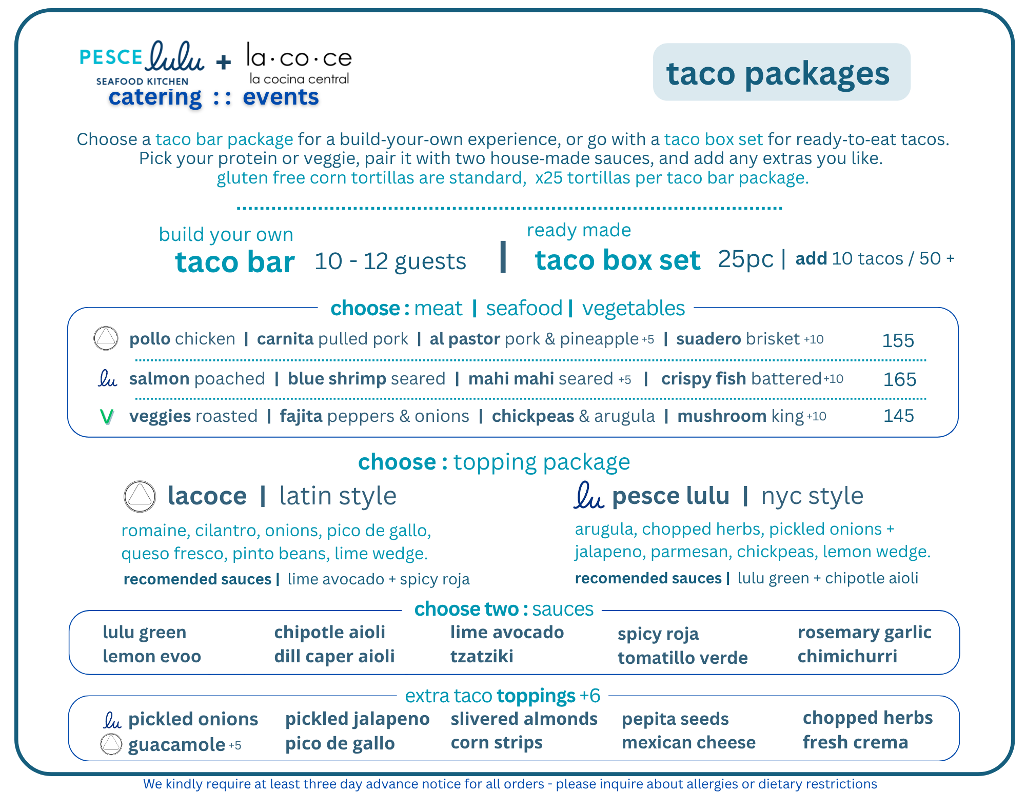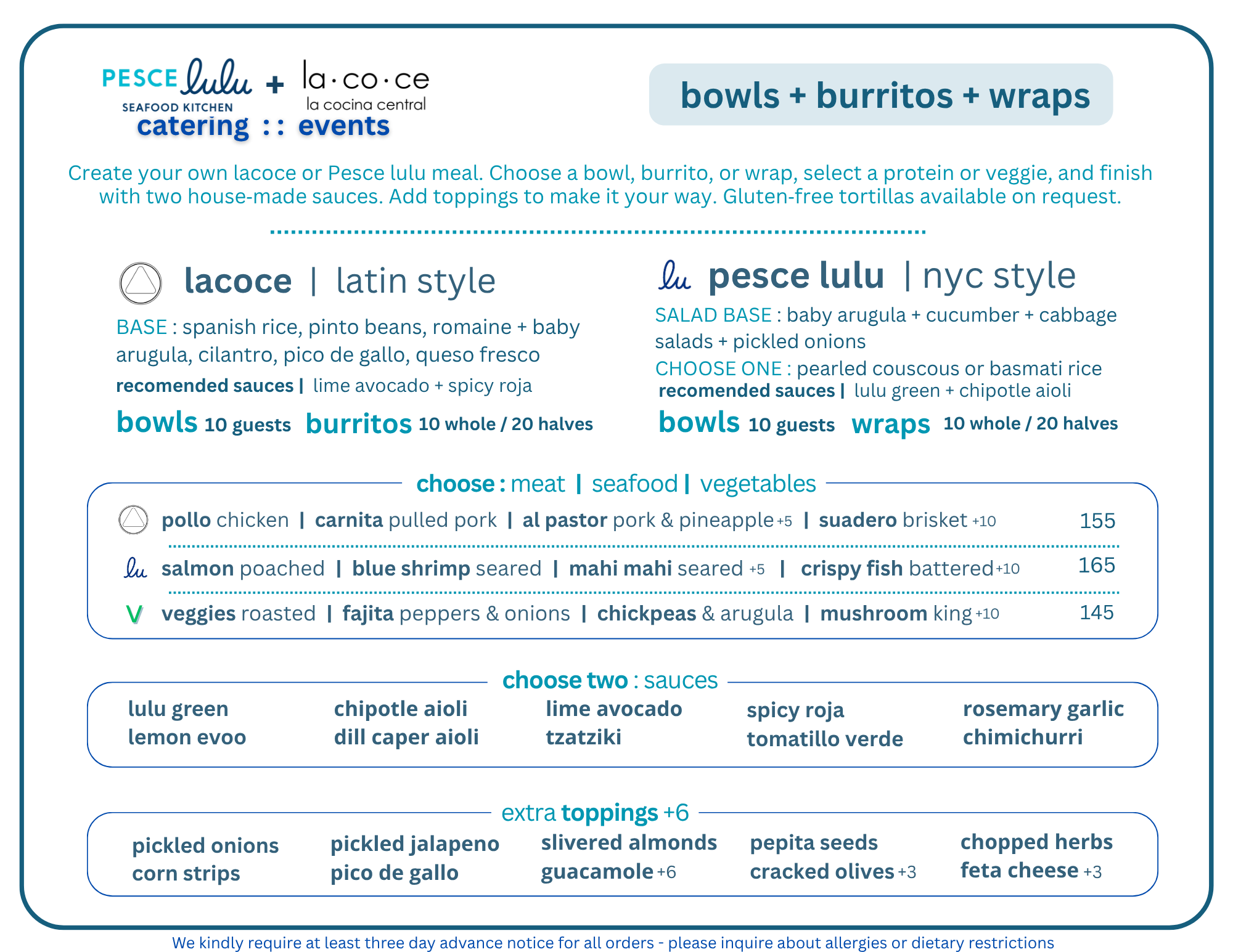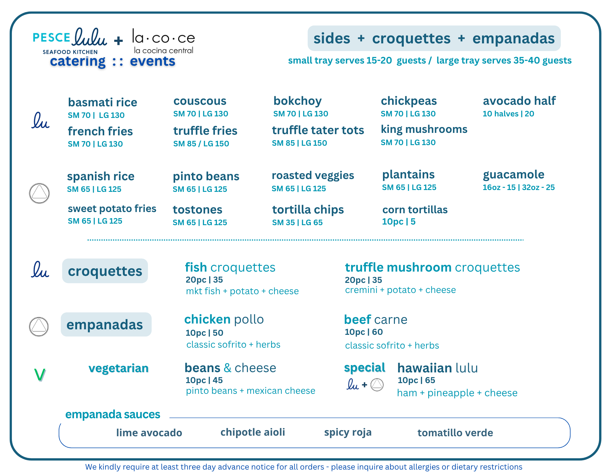 Questions? See our Catering FAQ below, or shoot an email to info@pescelulu.com.